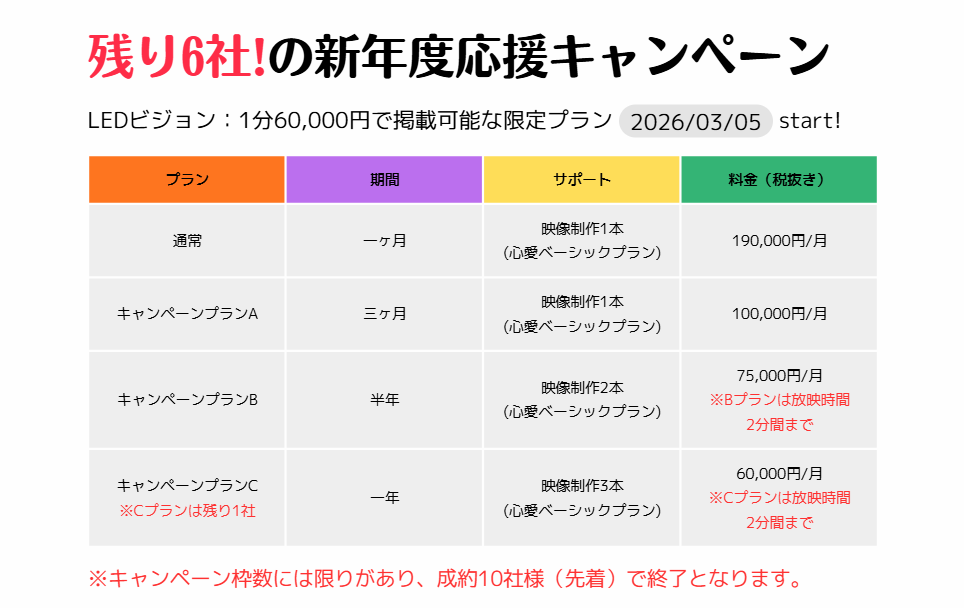 | 通常プラン | 現在キャンペーン中 190,000/月 | 現在キャンペーン中 100,000/月 | 現在キャンペーン中 75,000/月 | 現在キャンペーン中 60,000/月 残り1枠 |